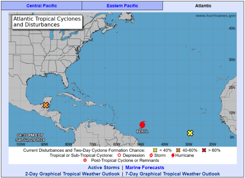 El Centro Nacional de Huracanes de Miami, Florida (NHC, por su sigla en inglés) informó este sábado que Beryl se convirtió en un huracán con vientos máximos sostenidos de 75 millas por hora (120 kilómetros por hora) y que se prevé que se intensifique rápidamente.