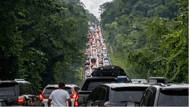 Baní, Peravia. — Cientos de vehículos transitan por las carreteras y calles de las provincias del Sur y Suroeste del país, movilizando a miles de personas que se trasladan durante esta Semana Santa para visitar familiares, playas y balnearios desde este Jueves Santo hasta el Domingo de Resurrección.