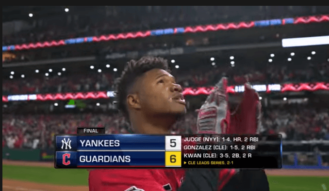El dominicano González, un héroe en el comienzo de los playoffs, encontró un lanzamiento de Clarke Schmidt, con cuenta de 1-2, y envió una línea a la pradera central, para empujar al novato Steven Kwan y al también quisqueyano Amed Rosario.