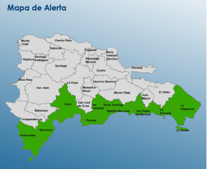 El organismo puso en nivel de alerta verde al Distrito Nacional, Santo Domingo, Pedernales, Barahona, Peravia, La Romana, Azúa, San Cristóbal, San Pedro de Macorís y La Altagracia. Además, está en alerta vede la Isla Saona.