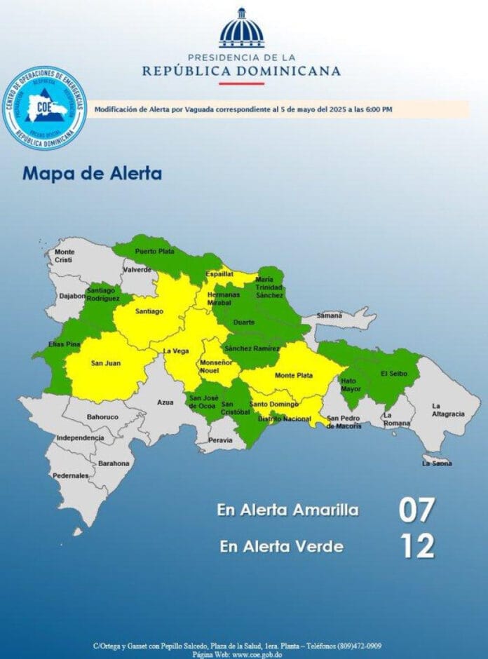 El Centro de Operaciones de Emergencias (COE) colocó este lunes a 12 provincias en alerta en verde y otras siete en alerta amarilla por posibles crecidas de ríos, arroyos y cañadas, así como inundaciones repentinas o urbanas.