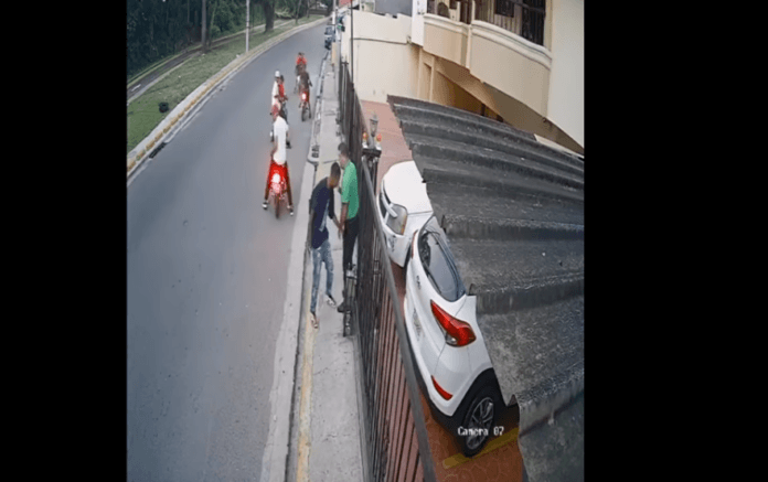 En el momento en que se retiraban del lugar, un carro pasó cerca y los ladrones procedieron a apuntarlo con sus armas de fuego, mientras uno de estos le lanzó una patada al vehículo, para luego marcharse de la escena.