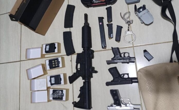 Asimismo, tres pistolas con su cargador y 22 cápsulas, un cargador adicional con 30 cápsulas, un par de esposas, tres celulares de distintas marcas y un dron.