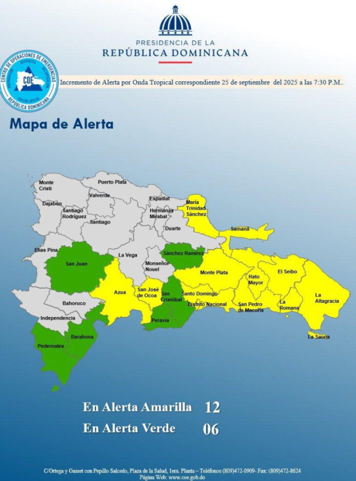 El Centro de Operaciones de Emergencias (COE) informó que 17 provincias, y el Distrito Nacional, están en diferentes niveles de alerta debido a la actividad de una onda tropical y una vaguada en la tropósfera.