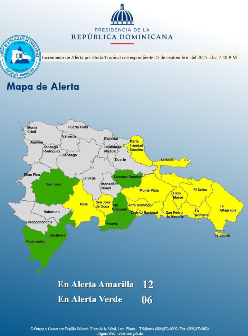 En ese sentido, 12 localidades se encuentran en alerta amarilla, siendo estas Santo Domingo, María Trinidad Sánchez, San Pedro de Macorís, La Altagracia, El Seibo, Azúa, Distrito Nacional, La Romana, Samaná, Hato Mayor, Monte Plata y San José de Ocoa.