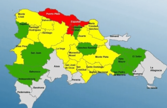 En alerta roja se encuentran Puerto Plata y Espaillat, mientras que en amarilla figuran Monseñor Nouel, Valverde, Santiago, La Vega, Montecristi, Elías Piña, María Trinidad Sánchez, Santiago Rodríguez, San Cristóbal, el Gran Santo Domingo, Monte Plata, San José de Ocoa y Duarte, especialmente la zona del Bajo Yuna.