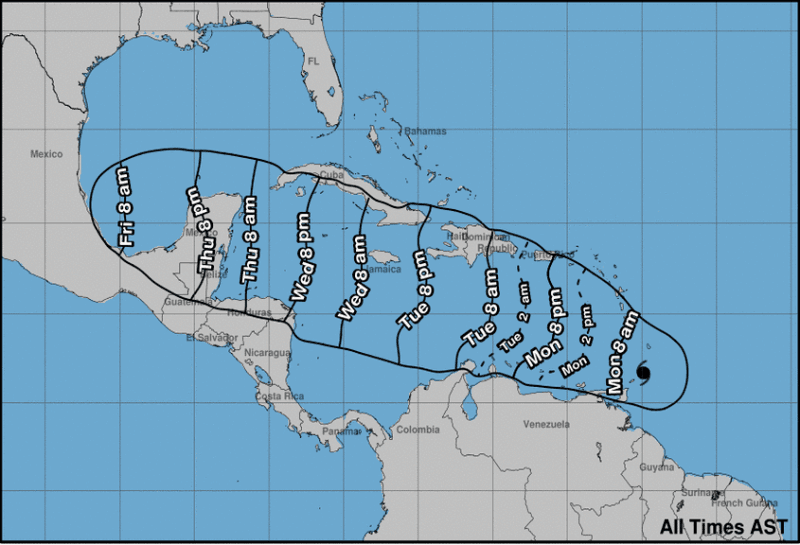 El NHC, con sede en Miami (Florida), informó de alerta de huracán para Barbados, San Vicente y las Islas Granadinas, Granada y Tobago, como también amenaza de tormenta tropical para Martinica, Trinidad y Santa Lucía.