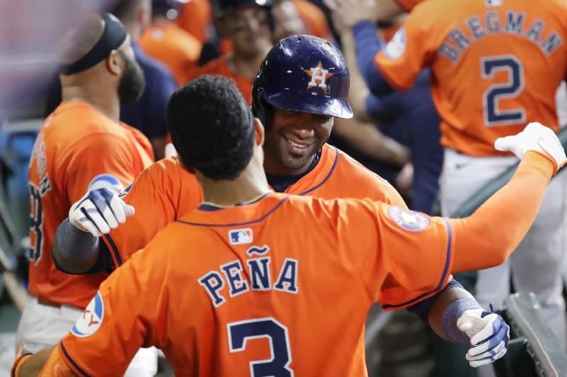 El venezolano José Altuve bateó un sencillo remolcador en el sexto y Álvarez logró otro jonrón en su siguiente turno, esta vez poniendo la bola en el bullpen entre el jardín derecho y central ante Jordan Montgomery, lo que colocó el juego en 8-0.