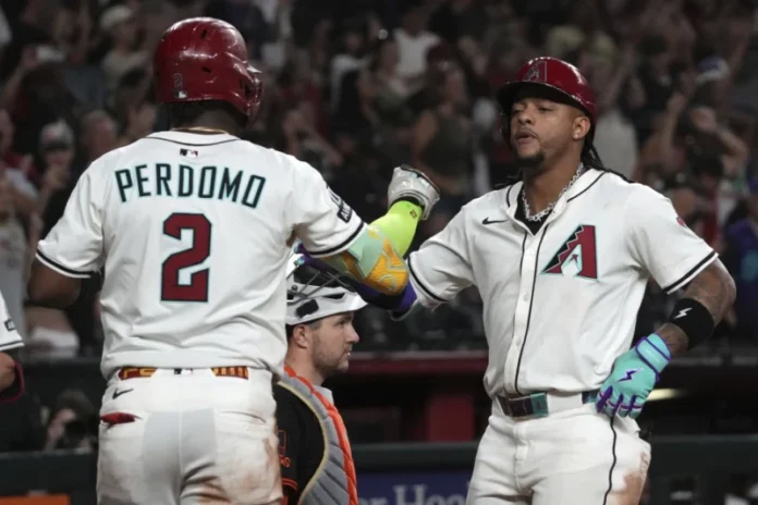 Los Gigantes ganaban por 5-3 al inicio de la novena entrada, pero el dominicano Geraldo Perdomo comenzó con un sencillo y luego su compatriota Ketel Marte —quien fue nombrado titular del Juego de Estrellas de la Liga Nacional en la segunda base horas antes— sacudió un jonrón que empató el juego contra el también quisqueyano Camilo Doval.