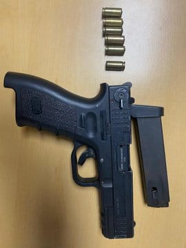 Los agentes actuantes le ocuparon la pistola (de fogueo-no letal) marca Ceonic, cal. 9mm, serie M22 C1YIAMIYS03 22 09026, con su cargador y seis cápsulas.