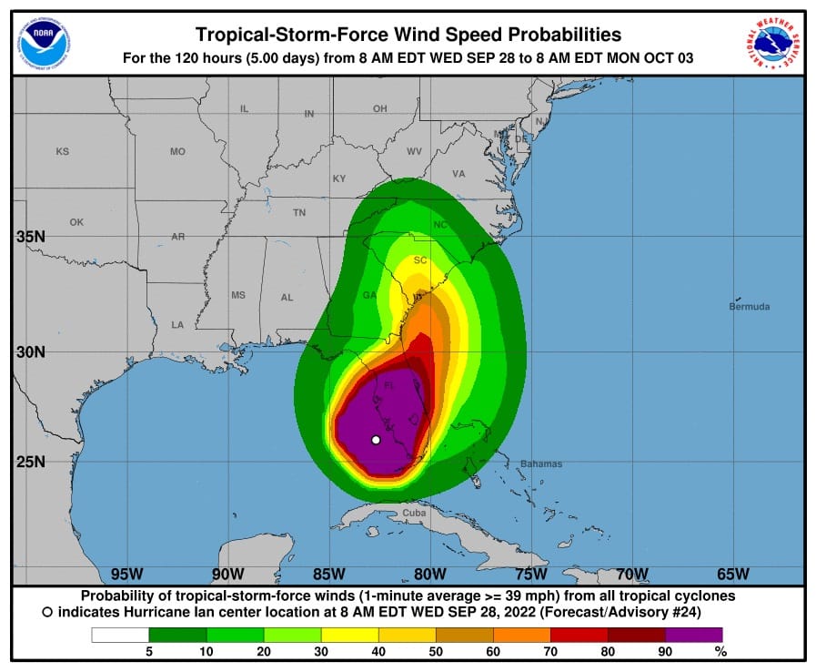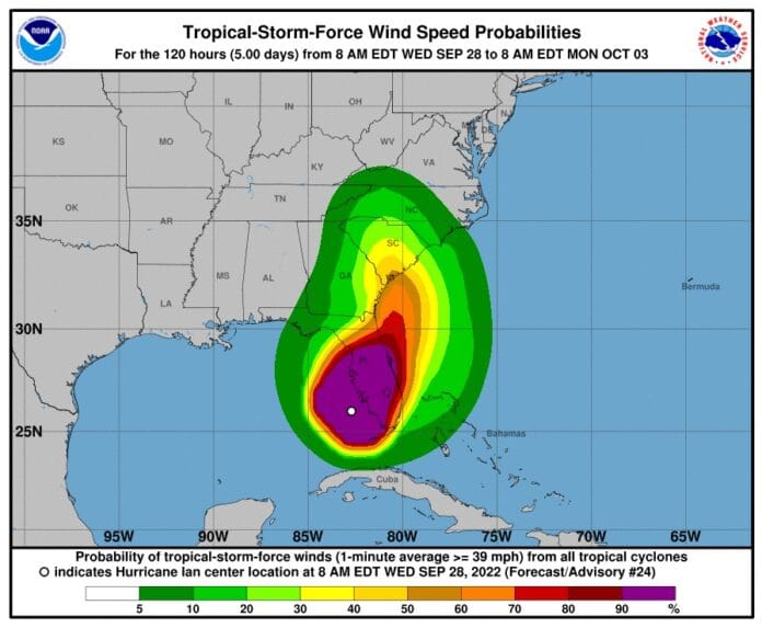 Ian es un huracán potencialmente catastrófico, con vientos máximos sostenidos de unas 155 millas por hora (250 kmh) y rachas más fuertes, muy cerca de la categoría 5, que empieza cuando los vientos máximos sostenidos alcanzan las 157 mph.