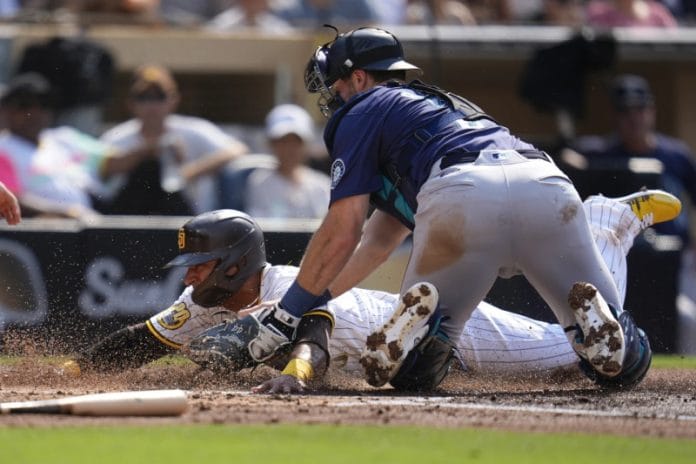 San Diego montó una última amenaza en la novena. Jake Cronenworth y Manny Machado recibieron bases por bolas para liderar y avanzaron a segunda y tercera con un rodado de Donovan Solano. Se quedaron varados cuando Jackson Merrill se ponchó y David Peralta bateó una línea al campocorto JP Crawford para darle a Andrés Muñoz su 15to salvamento.