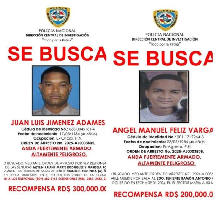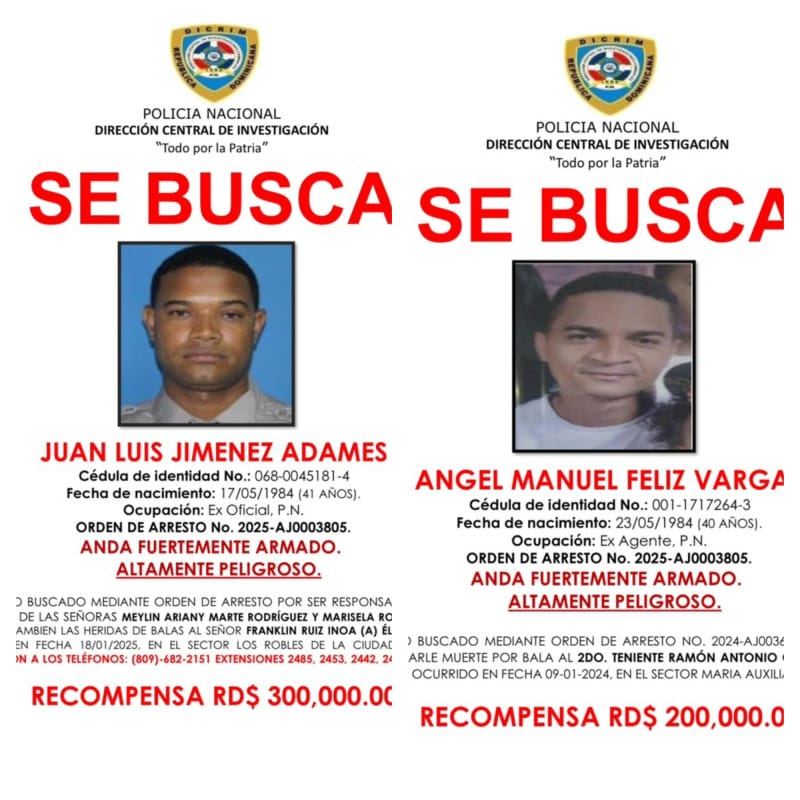 La Policía Nacional ofreció este miércoles recompensas por información que permita la captura de Juan Luis Jiménez Adames y Ángel Manuel Feliz Vargas, ambos ex miembros de la institución vinculados a graves hechos criminales.