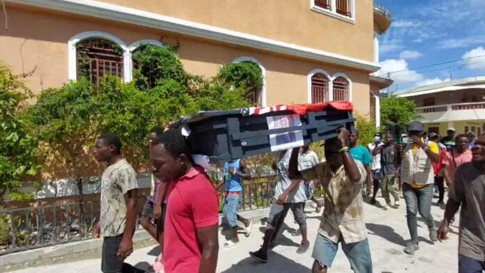 Ataúd con foto de Ariel Henry en la comuna Les Cayes