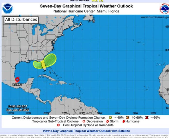 En paralelo, en el Atlántico mexicano, la depresión tropical Dos se intensificó como Barry, la segunda formación con nombre de la temporada 2025 en ese océano.