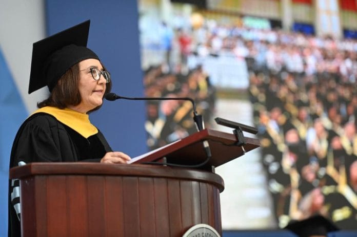 El discurso de honor estuvo a cargo de la educadora Ana Margarita Haché de Yunén, quien precisamente este junio del 2024 cumple 50 años de haberse graduado en esta universidad, para entonces la Católica Madre y Maestra.