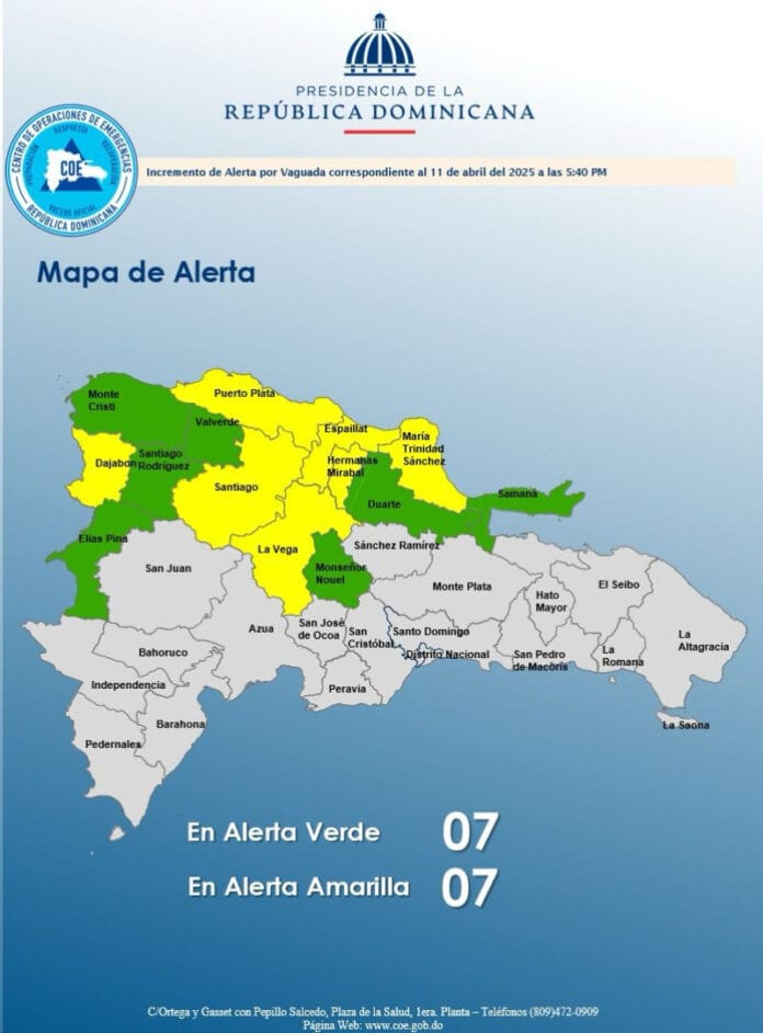 Otras siete provincias se encuentran bajo alerta verde las provincias de Samaná, Duarte, Monseñor Nouel, Valverde, Santiago Rodríguez, Elías Piña y Montecristi. La alerta verde señala que la población debe estar atenta al posible impacto de un fenómeno atmosférico.