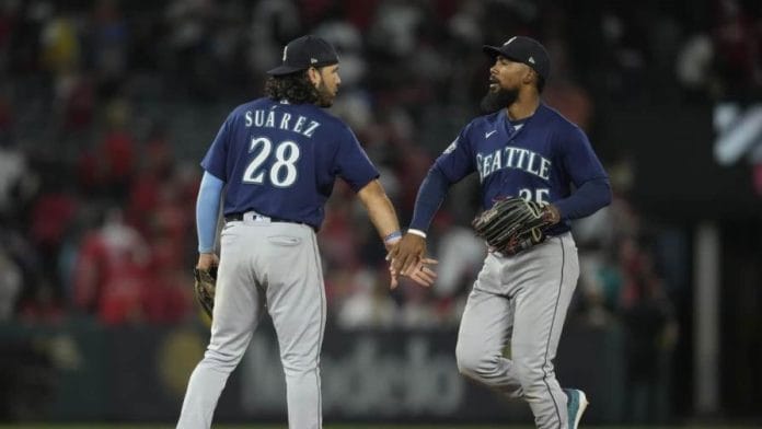 El venezolano Eugenio Suárez empujó la carrera de la ventaja en la octava entrada y enhebró su décimo juego con al menos una producida para imponer un récord de la franquicia de los Marineros de Seattle, quienes se impusieron el viernes 9-7 a los Angelinos de Los Ángeles.