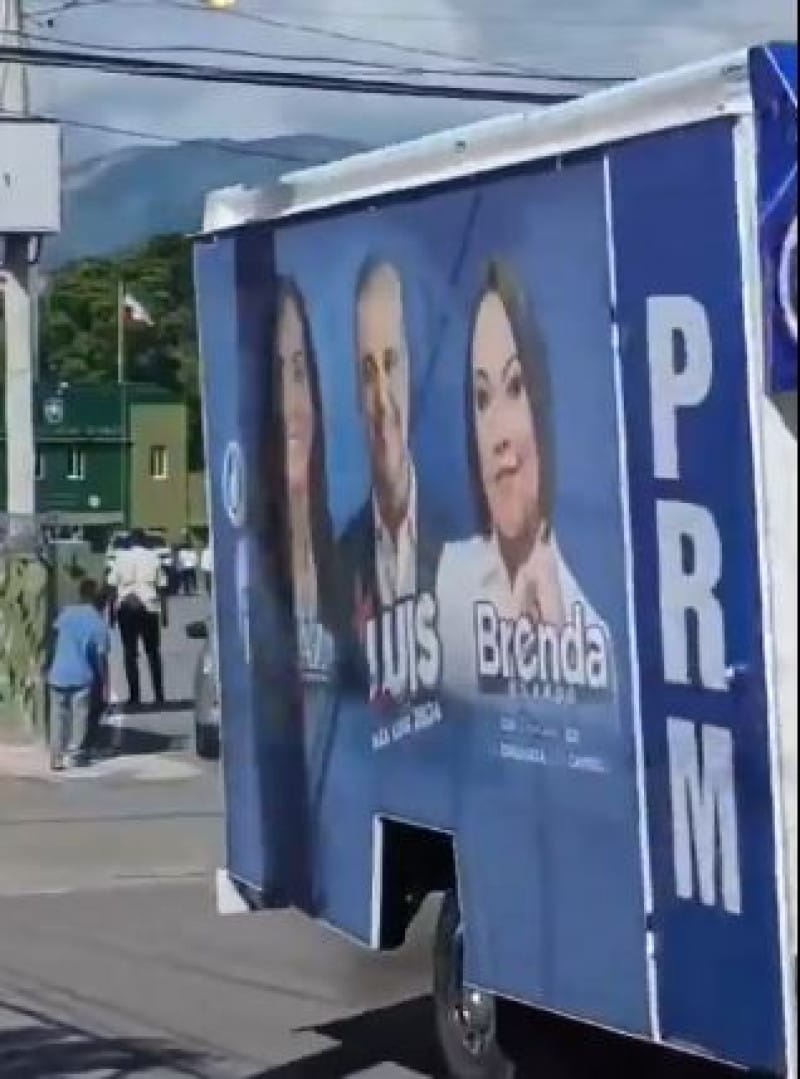 El audiovisual muestra como varios vehículos salían del recinto militar, entre los que se encontraba un camión con los colores del PRM y con la imagen de Abinader en el centro junto con otras dos candidatas del partido oficialista.